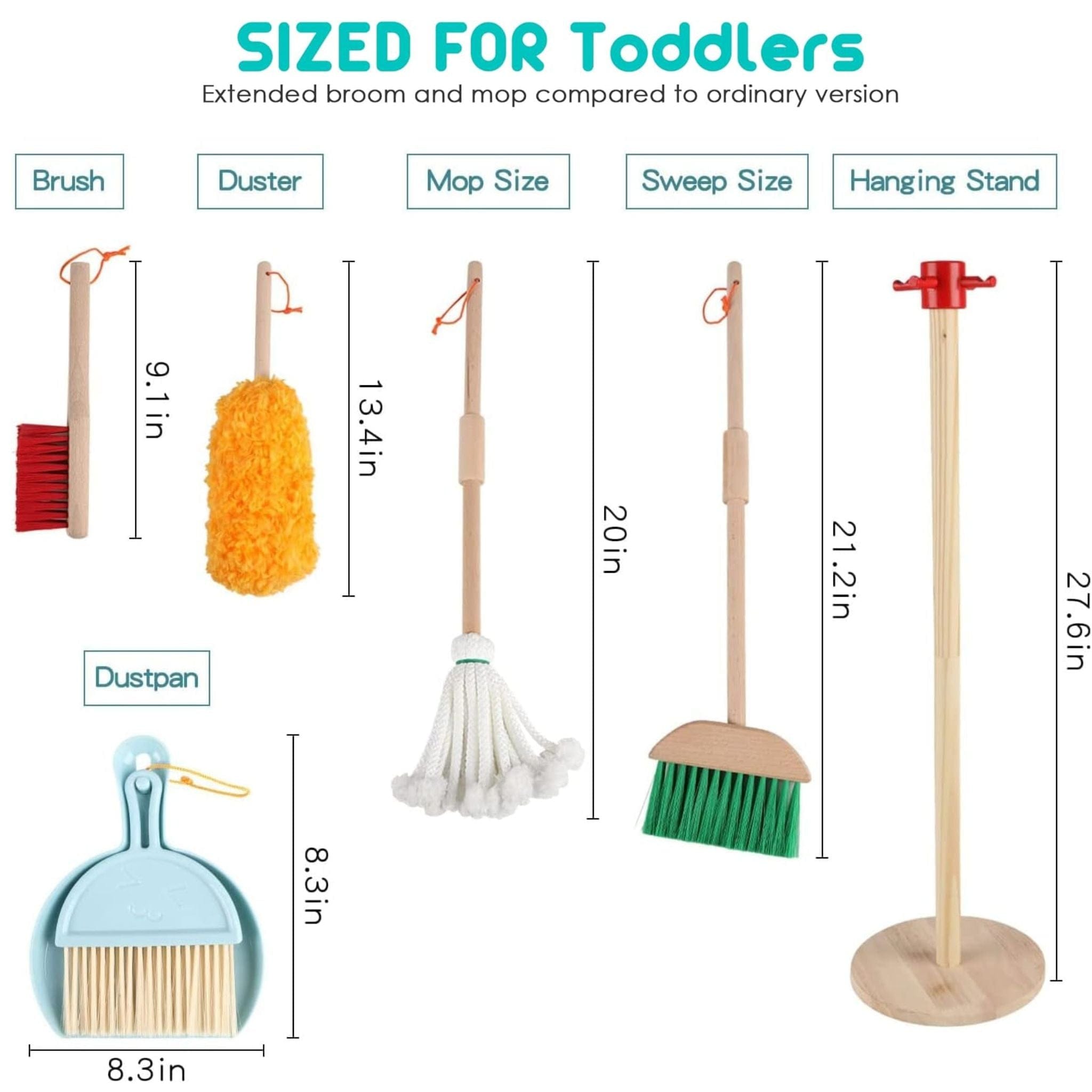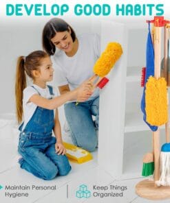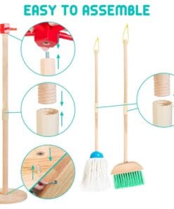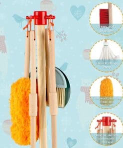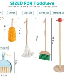 - Child-Sized Cleaning Tools: Includes a broom, mop, dustpan, duster, scrub brush, and a sturdy wooden stand to keep everything organized.