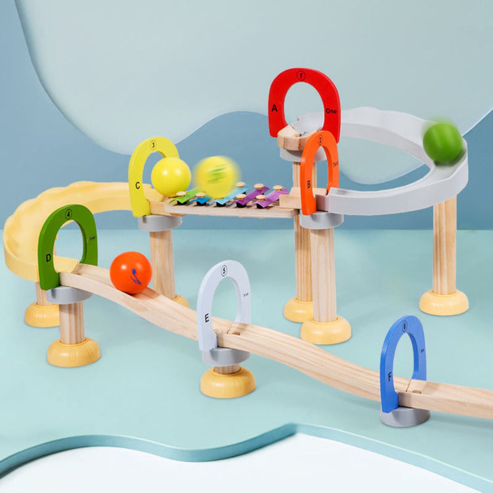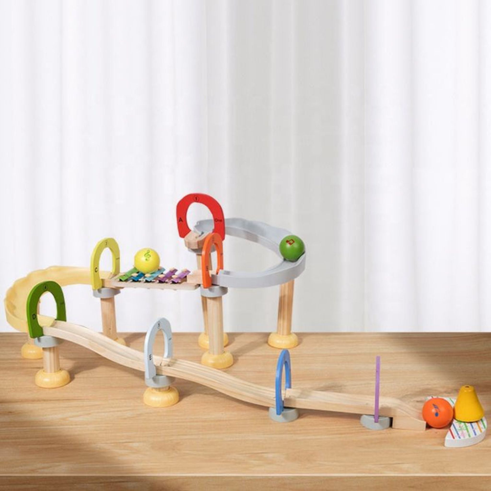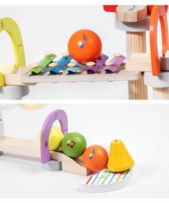 - Musical Tracks: The set includes a variety of wooden tracks and components that, when assembled, guide marbles to strike xylophone keys, creating enchanting musical notes as they roll down.